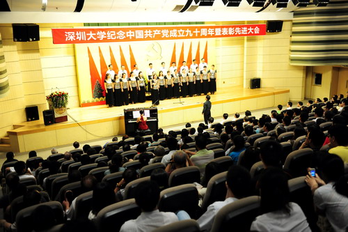 6月22日下午,深圳市委教育工委庆祝中国共产党成立90周年大会在市民中心举行,市委副书记王穗明出席会议并为教育系统优秀党员和优秀党务工作者代表颁奖。我校领导江潭瑜、陶一桃,相关部室、学院负责人,先进基层党组织、优秀党员和党务工作者代表及参加“鹏城校园党旗红”主题汇演的教师合唱团成员出席活动。