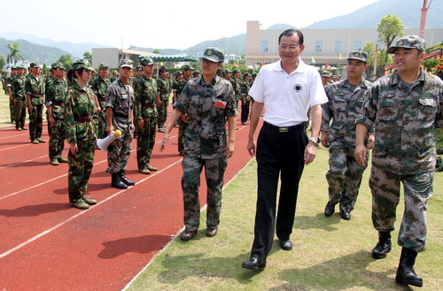 9月21日上午,校党委书记江潭瑜一行到军训二团三团看望新生。 江潭瑜首先在校党委武装部部长谢海均,预备役防化团政委余富荣,军训三团团长徐军民、政委程浩等陪同下巡视了三团训练基地、营房和饭堂,对参训学生的训练、住宿和生活条件进行了检查,并听取了余富荣上校和程浩政委的汇报。江潭瑜对军训三团前阶段工作表示肯定,对三团将学生关爱行动带到军营、将大运会志愿者管理中一些行之有效的管理和激励措施灵...
