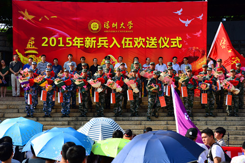 9月8日下午,在我校演会中心门口举行2015年新兵入伍欢送仪式。副校长李凤亮,南山区区委常委、区武装部政委余富荣上校,武装部、应征入伍学生所在学院的领导,学生部、各学院学生代表,2015年退役老兵,新兵亲属参加欢送仪式。 经过层层严格选拔,我校光电学院孙册等26名同学脱颖而出,光荣加入中国人民解放军。 在欢送仪式上,李凤...