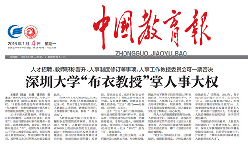 《中国教育报》2016年1月4日头版头条报道我校“布衣教授”掌人事大权。全文如下: 乐竞平台的人事事项,人事工作教授委员会(简称人教委)最有发言权。13名委员都是没有领导职务的“布衣教授”,但他们敢刷掉主管人事工作的副校长的博士生李扬(化名)。 2014年深大招聘教师,李扬夜访社科学院教授、人教委主任姜安,自报家门,姜安当即表态对所有应聘者一视同仁。最终李扬落败。姜安说,他们之所...