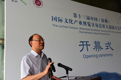 5月10号下午,第十三届中国(深圳)国际文化产业博览交易会深大荔园分会场开幕式在我校科技楼一楼北区举行。共青团深圳市委书记刘广阳、南山区政协副主席刘根平、南山区文产办主任程红坤、南山区文产办副主任孙宪章、我校党委书记刘洪一、副校长徐晨,各学院、机关部室、教辅单位负责人、师生代表、第二届“印象杯”文创节校园纪念品设计大赛获奖同学出席了此次开幕式。徐晨主持开幕式。