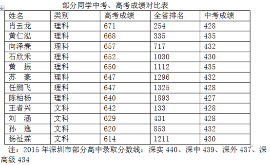 深大附中2018年高考高分率、本科率均创历史新高。全部557名考生,达广东省高分优先投档线率为73.1%,本科率达99.6%。 拔尖人才达到新高度。其中,600分以上47人,有望被名牌大学录取。文科考生王者兴642分,列广东省第133名。理科考生肖云龙671分,全省第254名。音乐考生兰甜文化成绩592分,全省第5名。美术考生任雨晴文化成绩576分,全省第55名。 高进优出获得新成效。拿云实验班100%超高分优先投档线。一批中考成绩列全市8000名左...