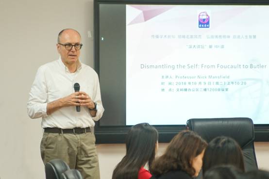 10月9日上午,深大讲坛第101讲在外国语学院会议室开讲。来自澳大利亚麦考瑞大学的Nick Mansfield教授带来了题为“Dismantling the Self: From Foucault to Butler”的讲座。 Nick Mansfield以“拆解自我”(Dismantling the Self)为题,深入浅出地点评了尼采、福柯、巴特勒的相关理论。其理论解读以这三者为中心,同时上至边沁、康德、笛卡尔,下及拉康、德里达、阿甘本诸人,可以从中看出其广博的哲学视野和深邃的分析能力。N...