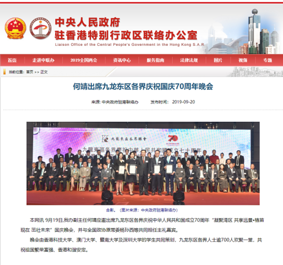 9月19日晚,香港九龙东区各界联会在九龙湾国际展贸中心举办九龙东区各界庆祝中华人民共和国成立70周年“凝聚湾区 共享远景•植苗现在 茁壮未来”国庆晚会,中央人民政府驻香港特别行政区联络办公室副主任何靖、全国政协原常委杨孙西等共同担任主礼嘉宾。晚会由香港科技大学、澳门大学、暨南大学及乐竞平台的学生共同策划,九龙东区各界人士逾700人欢聚一堂。 我校团委组织艺术团溯风舞团学生在晚会上表演舞蹈节目《溯》,舞蹈...