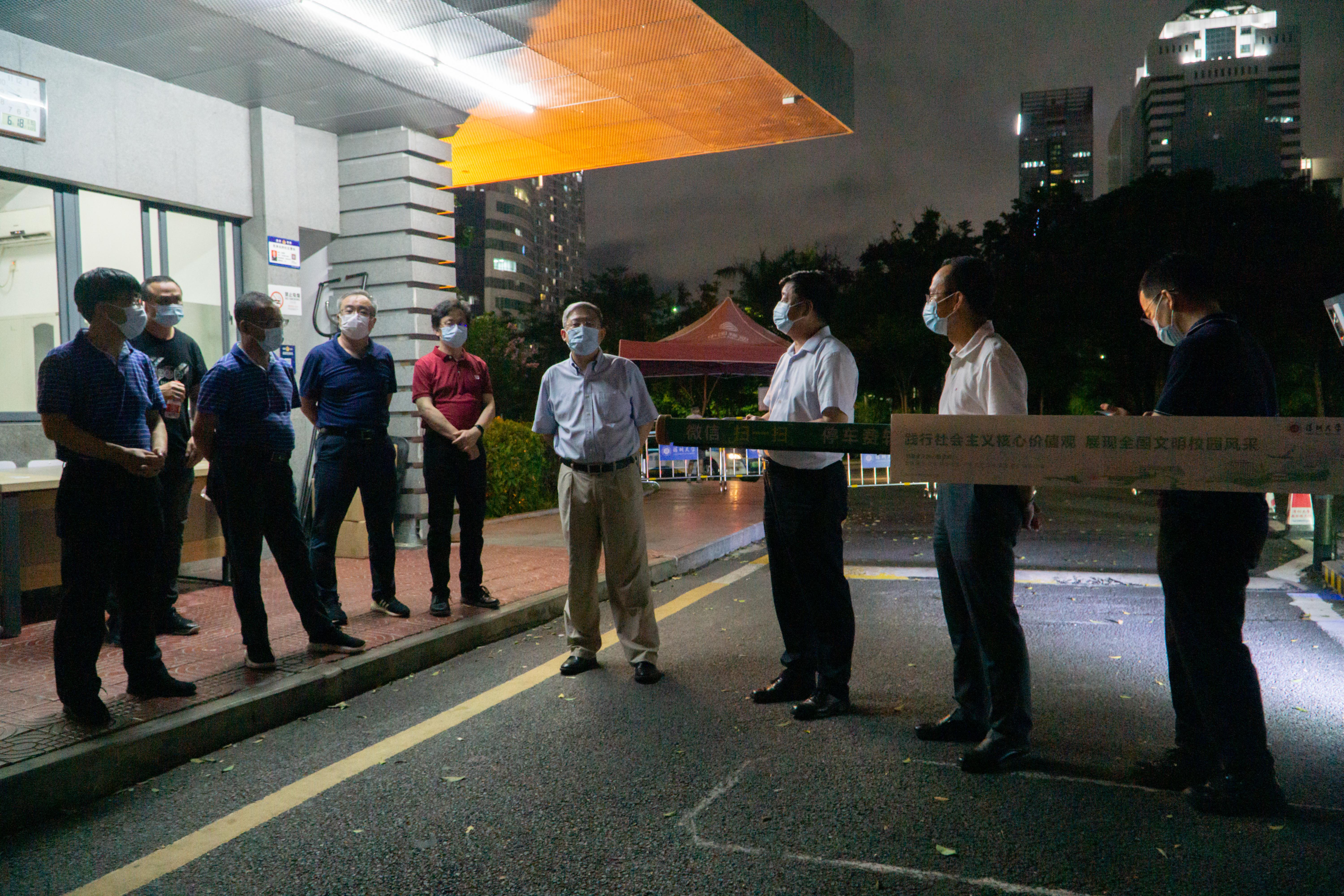 6月18日晚,乐竞平台党委书记、校长李清泉,副校长李永华前往粤海校区与沧海校区摸排检查校内疫情防控工作,并慰问坚守在一线的值班人员。学校党政办公室、党委宣传部、人力资源部、后勤部、安全保卫部等部门负责人陪同检查。