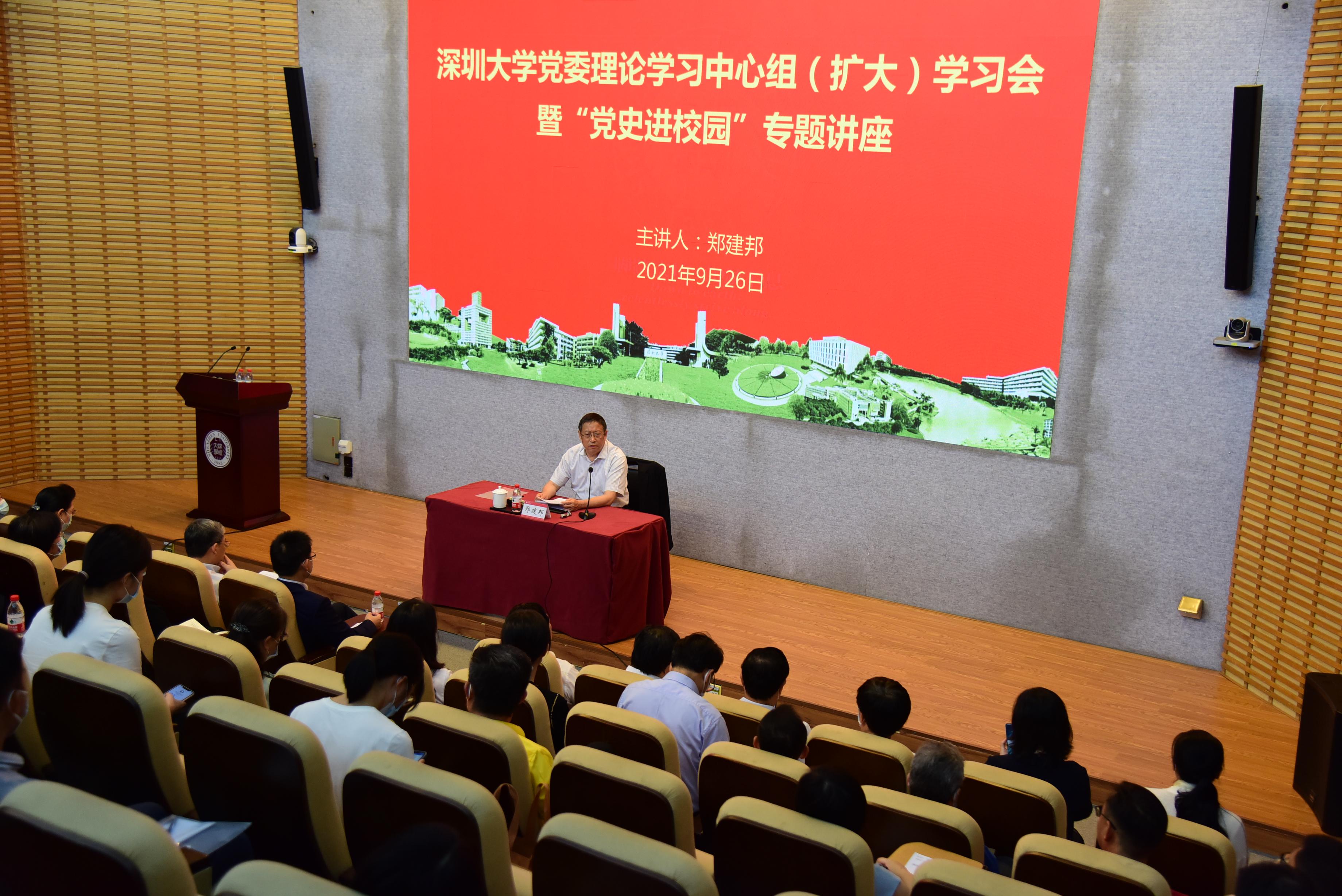 为庆祝中国共产党成立100周年,引导广大青年学生厚植爱党、爱国、爱社会主义的情感,坚定不移听党话、跟党走,9月26日,乐竞平台在汇星楼二号报告厅召开校党委理论学习中心组(扩大)学习会暨“党史进校园”专题讲座,全国政协副主席、民革中央常务副主席郑建邦作专题报告。深圳市政协党组书记、主席林洁,民革广东省委会主委、仲恺农业工程学院校长程萍,民革广东省委会副秘书长张翠娥,民革深圳市委主委、市地方金融监督管理局局长何杰,国际投资促进会会长、中国政法大学校董王平,以及省、市有关部门领导出席会议。我校党委书记、校长李清泉,学校党委副书记范志刚,副校长徐晨、李永华、汪永成、张晓红,机关各部室正职领导,教师、学生代表参会。会议由李清泉主持。
