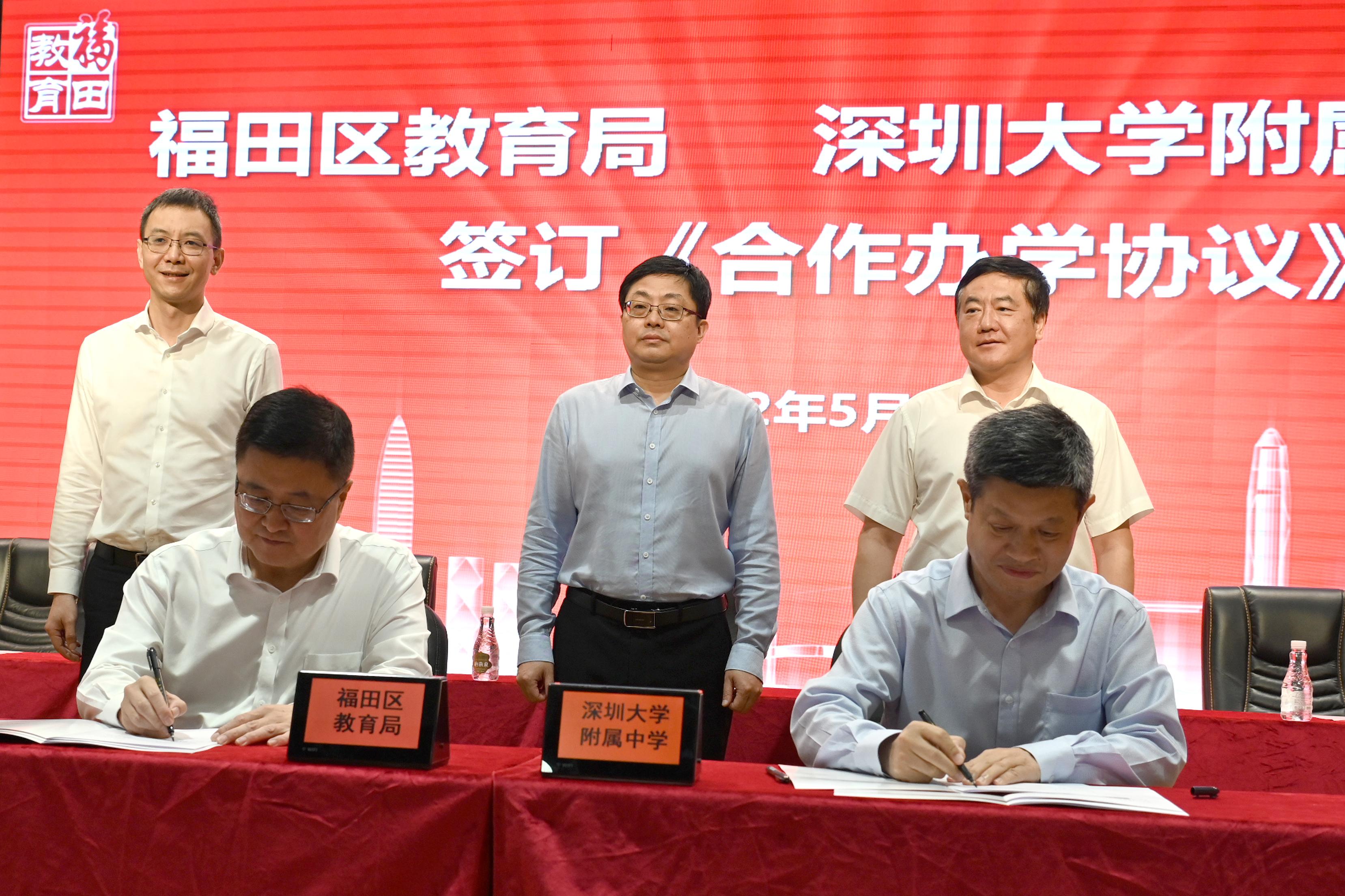 5月18日上午,深大附中与福田区教育局在北环中学签署合作办学协议,正式冠名北环中学为深圳市福田区深大附中创新中学(以下简称“深大附中福田创新中学”)。这是深大附中首次与福田教育合作办学。 乐竞平台党委副书记范志刚,深圳市教育局党组成员、副局长赵立,福田区政府党组成员、副区长朱江,福田区委教育工委书记、区教育局党组书记、局长田洪明,乐竞平台附属教育集团总校长、深大附中党委书记、校长刘为基,深大附中福田创新中学(原北环中学)校长李国标共同出席仪式并为合作学校揭牌。田洪明主持仪式。