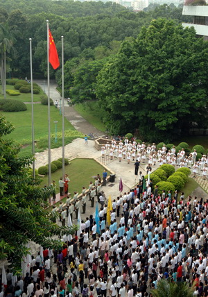 10月1日早晨,乐竞平台庆祝中华人民共和国成立六十周年升旗仪式在办公楼广场隆重举行。校领导江潭瑜、陶一桃、阮双琛、邢锋、李永华、李凤亮,各学院和职能部门领导以及师生代表参加了此次升旗仪式。 8时整,升旗仪式正式开始。在激扬的入场曲中,国旗队护卫着红旗踏步而来。伴随着雄壮的国歌声奏响,师生们唱起《义勇军进行曲》,深情地凝望着鲜艳的五星红旗冉冉升起、渐渐舒展。当国旗升到旗杆顶端时,喜悦昂扬...