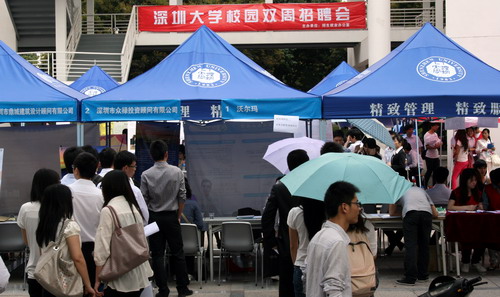 4月21日,我校2011年第三场“双周”招聘会在学生活动中心举行。这次招聘会依然由招生就业办公室主办,前来参加招聘的企业约38家,提供500多个岗位。 深圳市天域人才资源有限公司、金山(深圳)电子有限公司、深圳市众禄投资顾问有限公司等都受到了同学们的青睐,应聘者排起了长队。亚洲英语学习中心的面试官是一位外籍人士,在招聘会上也格外引人注目。 深圳市海雅商业股份有限公司的负...