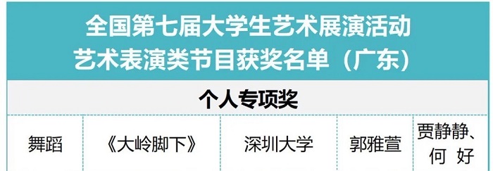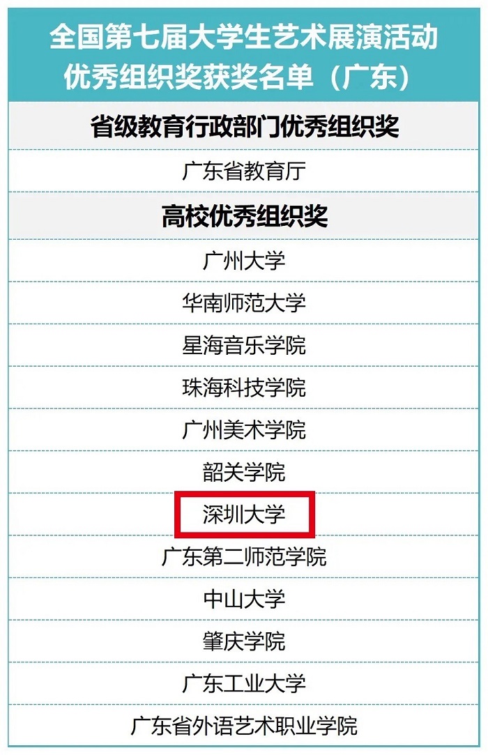 近日,教育部公布“全国第七届大学生艺术展演活动”优秀组织奖及各项目评选结果。在“全国第七届大学生艺术展演活动”中,共评出省级教育行政部门优秀组织奖32个,高校优秀组织奖261个;艺术表演类集体节目一等奖225个,二等奖297个,三等奖214个;艺术表演类个人专项奖50个;优秀创作奖156个;学生艺术实践工作坊一等奖57个,二等奖74个,三等奖58个;艺术作品类一等奖97件,二等奖129件,三等奖95件;高校美育改革创新优秀案例一等奖93篇,二等奖124篇,三等奖92篇;获得一、二、三等奖艺术表演节目、学生艺术实践工作坊和学生艺术作品的指导教师获指导教师奖。
