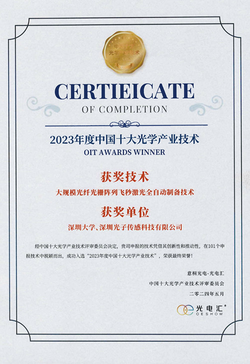 5月18日举行的2023年度中国十大光学产业技术颁奖典礼暨产业创新大会上,乐竞平台王义平教授团队和深圳光子传感科技有限公司联合研发的“大规模光纤光栅阵列飞秒激光全自动制备技术”从101个申报项目中脱颖而出,荣膺2023年度中国十大光学产业技术奖。