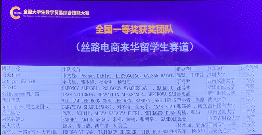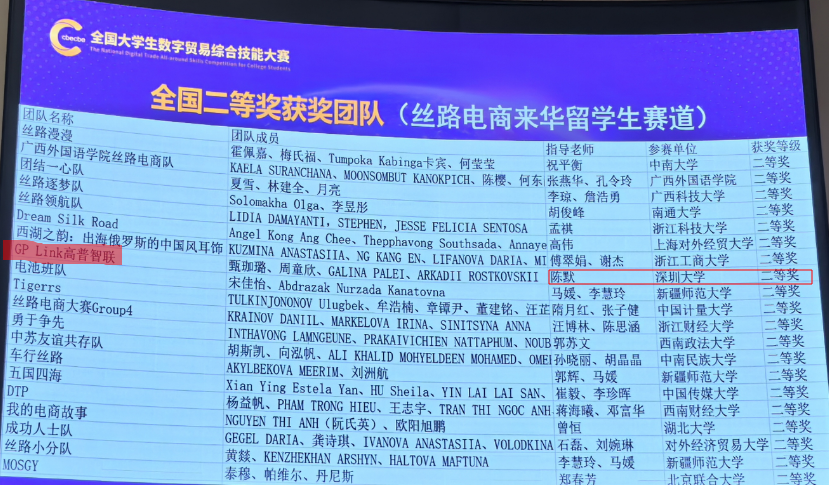 2024年9月29日,第三届全国大学生数字贸易综合技能大赛全国总决赛颁奖典礼在浙江大学紫金港校区金色大厅举行。在竞争激烈的丝路电商来华留学生创新创业赛道,43 所高校的71支队伍成功入围全国总决赛。由乐竞平台国际交流学院教师陈默指导的两支团队均入选全国总决赛。