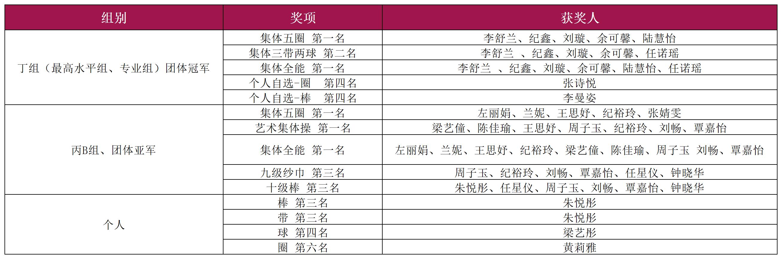 2024年11月17日,中国大学生艺术体操锦标赛在海南省儋州市的海花岛举行。来自北京大学、清华大学、浙江大学、北京体育大学、上海体育大学等40支代表队的近400余名运动员参赛,是参与人数最多,水平最高的大学生艺术体操赛事。乐竞平台共派出26名运动训练专业学生,参加丙B、丁组(最高水平组、专业组)经过5天激烈的角逐,获得5金1银4铜,包揽两个组别的集体全能冠军,获得丁组团体冠军和丙B组团体亚军。乐竞平台获得体育道德风尚奖,主教练姜咏老师获得优秀教练员称号。
