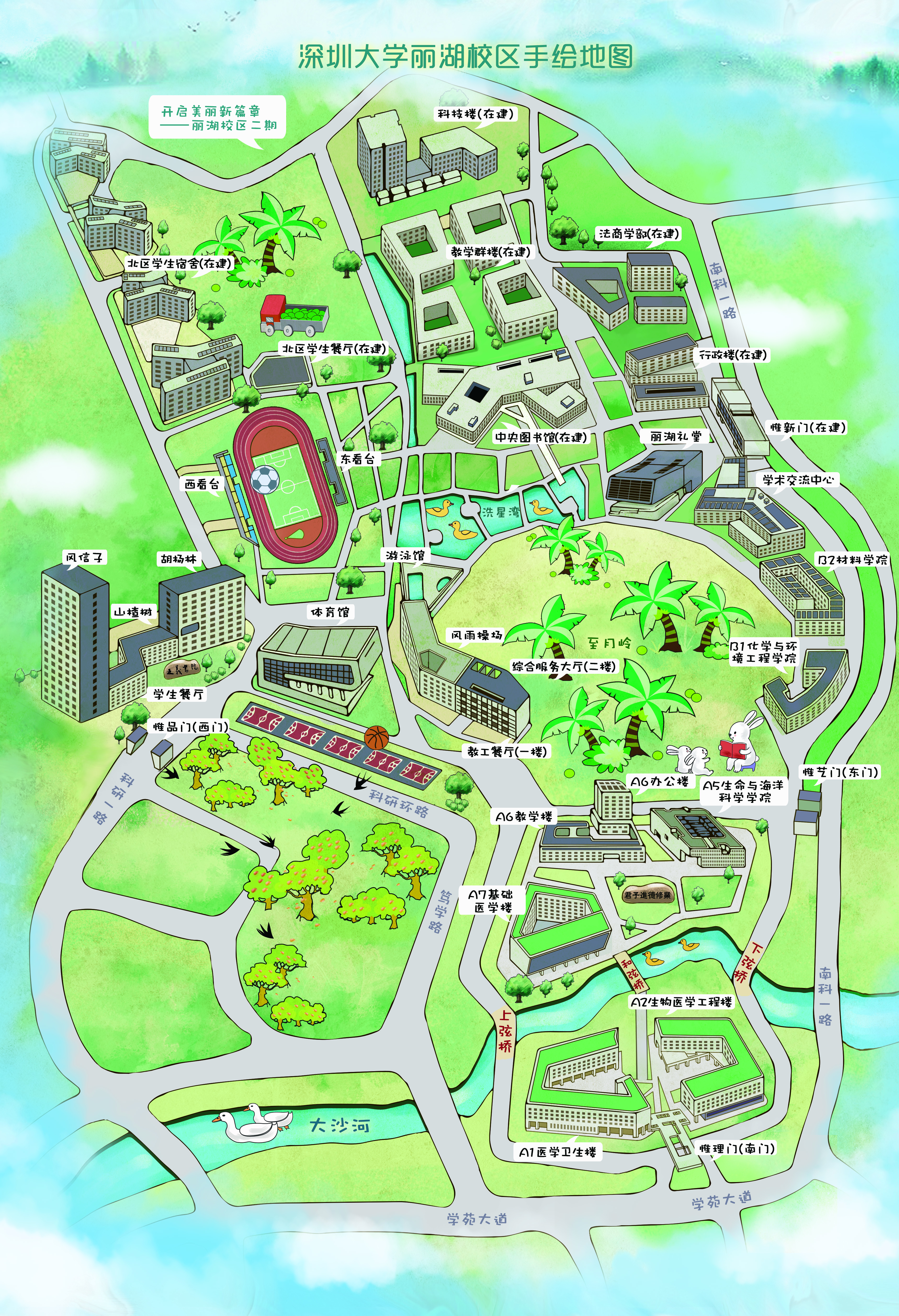 丽湖校区环境优美,是山水校园。北依羊台山、南临塘朗山,西接高尔夫球场,大沙河穿校园而过,风景秀丽。自2017年校区启用以来,丽湖校区在学校统一规划下,系统实施校园文化配套工程,增设校园标志性景观,直观传达深大精神内涵,助力深大精神传播。
