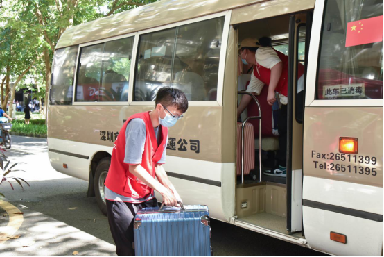 在校园内,为缓解深大内部交通紧张,学校义工联会同后勤部安排六辆大巴、六辆中巴,解决新生从校门到宿舍区搬运行李。同时,义工联根据学校安排,在学校各个校门、宿舍区、重要路口等地方设立13个服务摊点,以确保新生踏入学校的第一步就可以获得指引、搬运行李等协助,也确保新生的上车、乘车及下车等环节都有义工帮助。