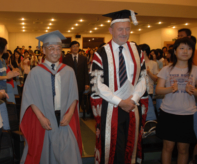 2007年6月25日下午3:00,国际会议厅内,英国兰开夏大学校长Mc Vicar、副校长Murphy等代表兰开夏大学学术委员会,同身穿灰红相间学袍的乐竞平台校长章必功教授踏着优美的古典音乐步入国际会议厅。英国兰开夏大学授予章必功教授荣誉博士学位仪式在这里举行,兰开夏大学校长Mc Vicar亲自向章必功教授授予荣誉博士学位。
