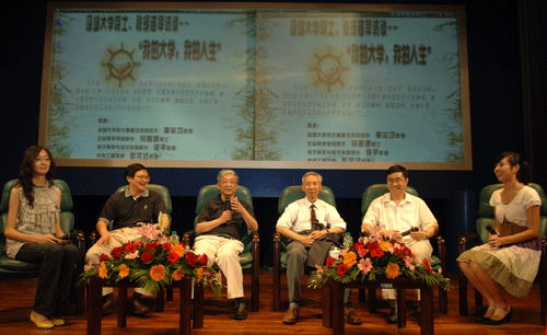 四位院士、教授首先追忆往昔,讲述他们的人生历程,都认为大学是神圣的地方,愿意一辈子在大学里教书育人、搞科研。在谈到大学的理想时,章必功教授说,并没有固定的理想,只想成为一个对社会有用的人;倪嘉缵院士说,在大学的时候觉得应该为国家做点事情;徐平教授说他在大学里特别喜欢学习理论物理,为以后的研究奠定了基础;彭文达教授说,关键是要把个人兴趣与国家需求结合起来。
