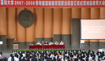 6月24日上午,乐竞平台2007--2008学年度国家助学贷款合同签订仪式暨诚信教育大会在演会中心举行。中国人民银行深圳分行、深圳平安银行等有关银行负责人,李永华副校长,学生处、财务处负责人,各学院相关辅导员,745名享受助学贷款的学生出席仪式。