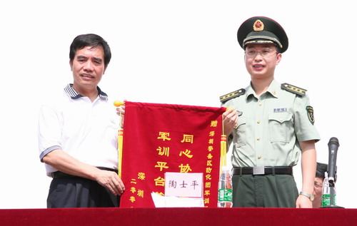 大会宣读了军训表彰名单,领导们为获奖集体、个人颁奖。军训期间,涌现了6个先进集体、195名先进个人。陶士平代表我校向深圳警备区防化团军训基地赠送写有“同心协力育栋梁,军训平台筑友谊”的锦旗。