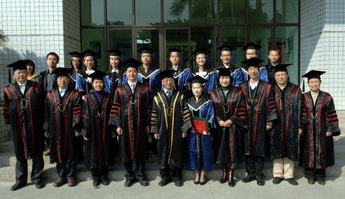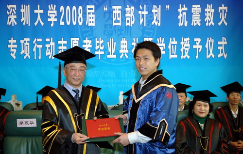 1月16日上午,在国际会议厅D厅,我校为2008届参加“西部计划”抗震救灾专项行动的九名志愿者同学举行简单而隆重的毕业典礼暨学位授予仪式。校学位评定委员会主席、校长章必功,校学位评定委员会副主席、校党委副书记陶一桃,副校长李永华,教务处、学生处、招生就业办、外国语学院、管理学院、法学院、物理科学与技术学院、信息工程学院、建筑与城市规划学院、土木工程学院负责人等主礼教授,相关学院师生代表和学生家长共同出席毕业典礼。李永华主持典礼。