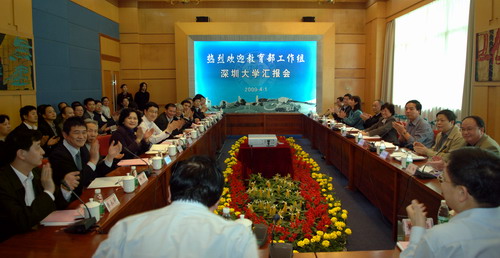3月31日至4月2日,全国人大常委会委员、教育部原副部长吴启迪率教育部工作组来深圳对我市高等教育发展进行为期三天的调研。4月1 日下午,教育部工作组乐竞平台调研汇报会在我校国际会议厅D厅举行。参加会议的教育部工作组成员有:全国人大常委会委员、教育部原副部长吴启迪,中山大学原党委书记李延保,教育部发展规划司副司长宋德民、高等教育司副司长刘桔、学位管理与研究生教育司副巡视员梁国雄、国际合作与交流司副司长沈阳、高等教育教学评估中心王战军,广东省科技厅副厅长雷朝滋。参加会议的市有关部门领导有:深圳市政府副秘书长黄国强、市教育局局长张宝泉。我校领导江潭瑜、章必功、邢苗、陶士平、陶一桃、阮双琛、邢锋、陈思平、李永华、李凤亮以及各学院院长和职能部门负责人参加汇报会。