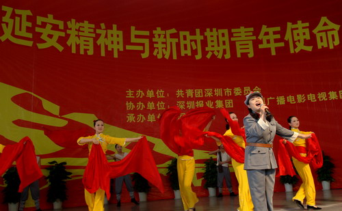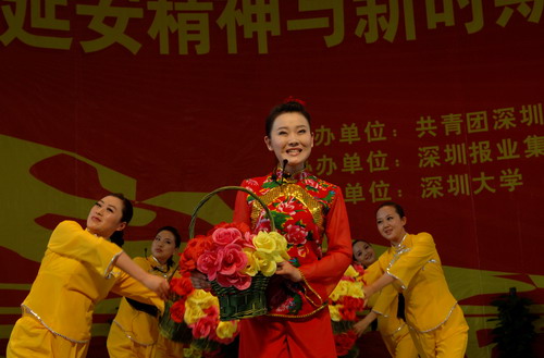 宣讲会在全场合唱《年轻的朋友来相会》的歌声中拉开序幕。在歌舞《中央红军到陕北》中,宣讲团成员以欢快的舞步、质朴的笑声、舞动的红绸生动再现了陕北人民欢迎中央红军的热烈场面。“窑洞的主人早已离去,离开后就再没有回来,留下这油灯、石砚,无言地讲述着那段故事……”宣讲团团长刘金林声情并茂地宣讲《延安窑洞有马列》的故事,令在场的师生为中国共产党人艰苦奋斗的精神心潮澎湃。革命歌曲传承着时代精神,唱响着时代的最强音。宣讲团为深大师生献上的《南泥湾》等脍炙人口的红色歌曲与《春天的故事》、《走进新时代》等反映深圳改革开放的歌曲交相辉映,体现出延安精神薪火相传、发扬光大的主题,深刻渲染和表达了延安革命精神、五四爱国精神、深圳特区精神的有力结合。歌舞《秧歌剧大串联》用歌舞歌剧等形式生动再现了当年火热的延安岁月,让台下的深大青年在轻松中感受到了陕北人民的热情纯朴和乐观执着的精神。延安革命纪念馆副馆长王晓莉深情宣讲的《父子情深》,形象地再现了毛泽东主席与儿子毛岸英之间在革命时期真挚的爱,令在场深大青年深深感动。小品《杨布浩进京》表现了一代伟人与老区人民之间相依难忘的动人故事,诙谐幽默的语言,发人深思的立意,赢得了全场青年们的热烈掌声。宣讲会在全场青年学生们与宣讲团成员一起高唱《歌唱祖国》的嘹亮歌声中结束。