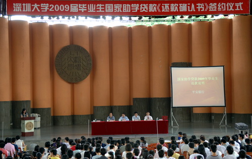 6月2日上午,我校2009届毕业生国家助学贷款《还款确认书》签订仪式在演会中心举行。深圳平安银行深圳分行行长陈靖、深大支行行长丘红兵,我校学生处、计财处负责人及各学院辅导员、2009届获贷毕业生等近500人参加仪式。