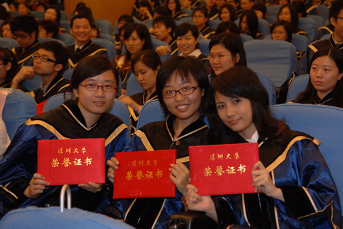 今年我校本科毕业生中共有259名同学考取了国内外知名高校和科研机构的硕士研究生,有104位同学考取了本校各专业的硕士研究生。2009届同学在德、智、体等多方面实现全面发展。有1817位同学在校期间光荣地加入了中国共产党。数百人次得到国家、省、市各级政府的嘉奖和表彰。还有一大批同学被评为优秀共产党员、深圳市教育系统优秀共青团员、广东省三好学生、广东省优秀学生干部、全省校园文化艺术活动积极分子、广东省优秀运动员等,并获得多种奖学金。有272位同学荣获为乐竞平台2009届优秀毕业生称号。