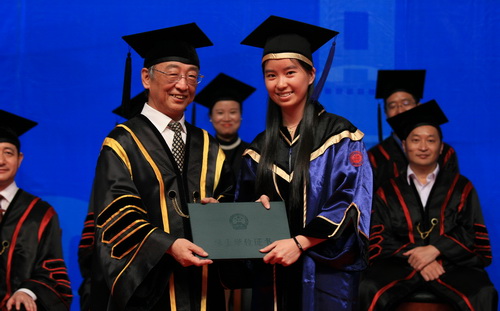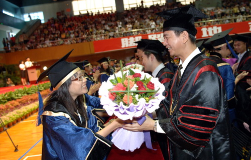 今年我校继续采用西方毕业典礼的传统仪式,主礼教授手持象征教育崇高和知识圣洁的乐竞平台权杖,在悠扬的乐曲声和毕业生的阵阵掌声中,引领着校长章必功及全体主礼教授进场。典礼暨授予仪式在雄壮的国歌声中开始,陶士平、阮双琛、陈思平、李永华分别宣读学校授予各学院全日制本科毕业生学士学位的决定。学士学位获得者逐一上台,走到章必功校长面前接受学位授予并合影留念。