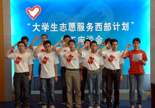 “到西部去、到基层去、到祖国最需要的地方去!”7月16日上午, “大学生志愿服务西部计划”义工座谈会在我校国际会议厅D厅举行,我校10名志愿者庄严宣誓。市委常委、市教育工委书记李意珍;市政府副秘书长,市抗震救灾对口支援工作领导小组前方指挥部总指挥,陇南市委常委、副市长张文;团市委书记刘燕,副书记张志华、赵嘉;市教育局副巡视员梁北汉;我校领导江潭瑜、陶一桃及我校“志愿服务西部计划” 赴地震灾区首批和第二批成员出席座谈会。