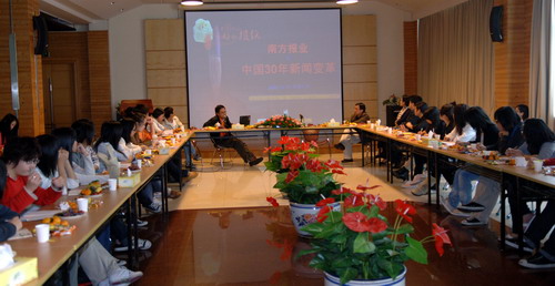 苟骅首先播放了一个南方都市报十周年庆短片――《我们的十年》,切入座谈会的主题。由短片提供的画面和少量对白让现场同学阐释其中的主题意蕴,同学们纷纷发表自己的看法。苟骅对发言同学的观点予以相当肯定,并由此推出新闻的角度是多样性的观点,记者观察的视角决定着新闻的深度和内涵。
