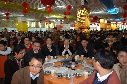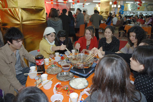 团圆饭在深大新西南餐厅举行。“虎踞龙盘今胜昔,花香鸟语旧更新”大红对联挂在西南餐厅的正中央,彩色气球、大红灯笼和师生们一张张喜气洋洋的笑脸相互辉映。师生间、同学间一声声“新年好!”“新年进步!”伴随着热腾腾的火锅,道出了留校师生对新的一年最美好的祝福。