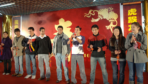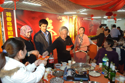 团年饭期间,留校师生歌舞庆春。一个热舞《叶子红》舞出了虎年红运当年;一首《快乐》唱出了同学们迎新年的好心情;新疆舞蹈、藏族歌曲清唱、藏族《锅庄舞》……师生们的热情一次次被点燃。来自新疆的维吾尔族、哈萨克族,来自西藏的藏族,来自贵州的布依族,来自辽宁的满族学生,还分别用自己的民族语言,道出对学校,对师生虎年好运的美好祝福,把团年饭师生同欢活动推向高潮。