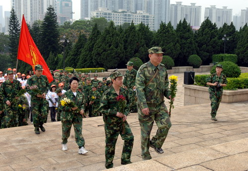 早上6点,经过崔晓汉的简单动员后,队伍步伐一致、斗志昂扬地从南区体育馆出发,途经红树林、深圳市会展中心、徒步25公里,于中午11:30左右顺利抵达深圳革命烈士陵园并举行仪式缅怀先烈。