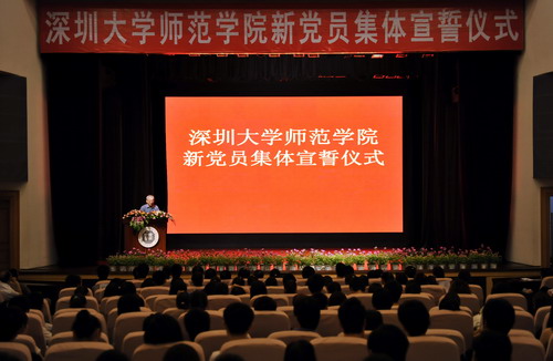 宣誓仪式在雄壮的中华人民共和国国歌中拉开帷幕。本次新党员中有研究生34人,本科生158人以及深大附中教师2人,学生16人。在师范学院党委书记潘海东的带领下,新党员们面对鲜红的党旗,举起右手庄严宣誓,要做一名为党和人民的利益奋斗终身的共产党员。