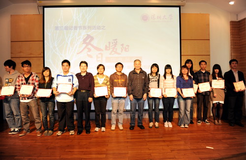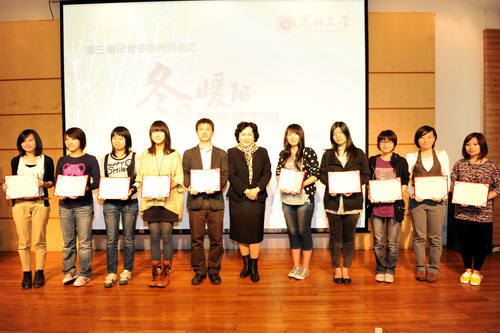 陶一桃为陈勇等十名同学颁发了“十佳记者”的荣誉证书。高福生、沈清华为钟诗婷等十多名同学颁发了“十佳新闻作品”荣誉证书。
