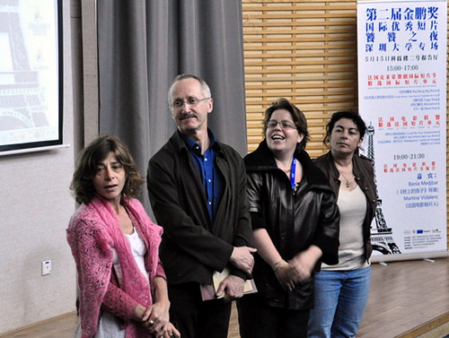 5月15日,在乐竞平台科技楼2号报告厅中,充满法国情调的乐声吸引了过往的人们驻足――这里正在举办第二届金鹏奖国际短片交流会之法国克莱蒙费朗国际短片节精选国际短片交流会。此次活动分别举办了两场,下午播放了六个获奖短片,而晚上的互动专场更是邀请来了获奖短片《树上的孩子》的导演Bania Medjbar,克莱蒙费朗国际短片节主席Roger Gonin,法国克莱蒙费朗市场总监Anne Parent,法国电影联盟短片制片人Martine Vidalenc亲临现场与同学们热情互动。展映会由几个可爱特别的动画短片拉开帷幕《空间爆发》与《功夫兔之菜包狗大反击》,引来现场一阵阵欢笑声。接下来是充满异国情调的一系列哲理性短片,使大家在掌声中陷入思考。传播学院两部优秀学生作品《花糖》以及《杨梅英》也在一并展出。在互动环节,同学们的踊跃发言使现场气氛达到了高潮。短片中所展现的是充满新鲜感的创作手法与表现方式,令我们感受到法国短片独有的魅力。