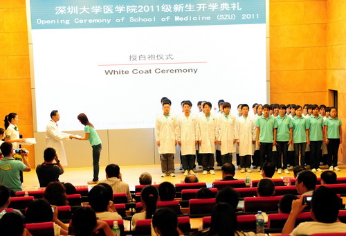 典礼在雄壮的国歌声中开始。陈思平宣读获得“迈科龙生物医学工程专项奖学金”的学生名单,王威琪、陈思平、尹立东一一为获奖者颁奖并合影留念。姜文奇、陈思平为新生代表佩戴校徽。钟南山为临床医学专业2011级新生授白袍。随后,临床医学专业新生在姜文奇院长的带领下庄严宣誓,决心为祖国医药卫生事业的发展和人类身心健康奋斗终身。