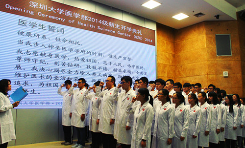 钟南山为临床医学专业新生一一授白袍。柯杨带领临床医学专业新生宣誓。深圳市南山医院院长骆旭东,深圳市卫生和计划生育委员会主任罗乐宣,北京大学党委常委、常务副校长柯杨分别致辞,对我校取得的成效表示祝贺,对我校医学部未来的发展提出意见和建议。