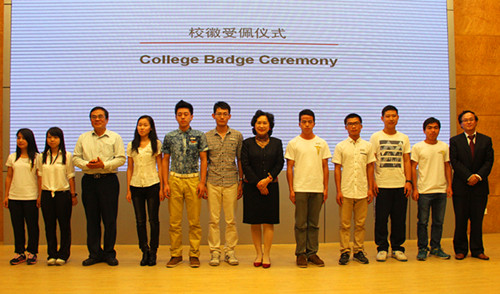 陶一桃、陈思平和管又飞为新生佩戴校徽并合影留念。