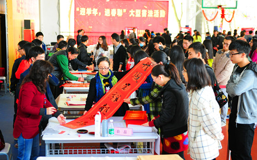 活动中,来自我校的书法老师和龙光书画院的书法家们现场挥毫,为广大师生写下一幅幅寓意吉祥如意的楹联,受到老师和同学们的称赞。作为文化产业研究院院长,李凤亮副校长亲笔为师生写春联,受到同学们的追捧。希望获得书法家们书写的春联的老师和学生络绎不绝,现场送出的大小春联有八百余幅。一幅幅春联翰墨神逸,寄托着对羊年的希望和祝福。除了提前书写和送出的春联,在场的书法家还将为我校学生宿舍楼书写春联。活动现场还设置了书法体验区,有书法兴趣的同学可以自己参与到活动中,亲笔挥毫写春联。