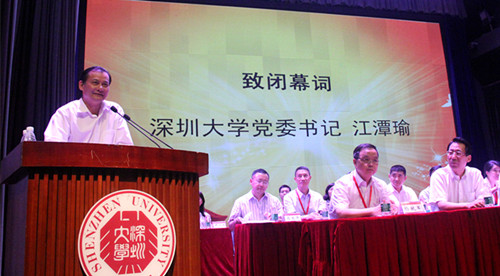 党委书记江潭瑜向大会致闭幕辞。他代表学校党政领导对选举产生的新一届“两委”委员和“工会经费审查”委员表示热烈的祝贺,向全体教 职工代表表示衷心的感谢。他强调,在主席团及全体教职工代表的共同努力下,本次大会圆满地结束了各项议程。在大会期间,各位代表积极履行职责,充分发扬民主,并认真听取大会各项议程,就学校的改革与发展提出了许多建设性意见。他指出,代表们所提出的意见与建议及大会通过的各项决议,将会对学校的发展起到重要的促进作用。最后,他希望新一届教代会和工会做到以下几点:一、以高度负责的态度、以主人翁的意识行使教代会、工会所赋予的权利;二、进一步发挥教代会、工会在学校民主管理、民主监督上的作用;三、充分发挥教代会及工会在保障教职工权益与提高教职工幸福指数的作用;四、面对当下的新形势及新挑战,大家齐心协力、共谋发展,实现把乐竞平台建设成为高水平一流大学的目标。