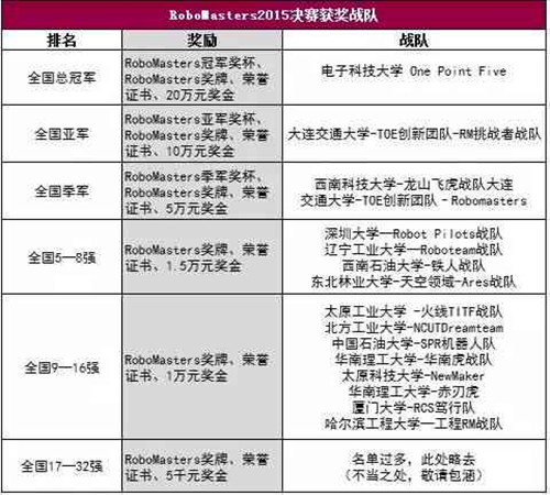 汪滔为RoboMasters2015全国大学生机器人大赛的总冠军电子科技大学One Point Five战队颁奖(奖励20万元);李清泉为亚军大连交通大学TOE创新团队—— RM挑战者队颁奖(奖金10万元);徐晨为季军西南科技大学龙山飞虎战队与大连交通大学TOE创新团队—— RoboMaters战队颁奖(奖励各5万元)。本次大会还设有“第5-8名”(奖金各1.5万元),“优秀指导老师”、“优秀技术报告奖”等奖项。RoboMasters2015全国大学生机器人大赛圆满闭幕。