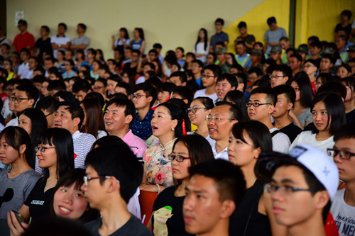 上午9时,演会中心外已有众多学生排队,秩序井然地凭票入场。9点30分,全场座无虚席,部分学生只能站在后排观看。当李克强总理宣布起立奏国歌时,全体师生起立,肃穆地凝视着大屏幕中缓缓上升的五星红旗并高唱国歌;当习近平总书记握拳向世界高呼“正义必胜、和平必胜、人民必胜”时,全场响起了如雷贯耳的掌声,响声此起彼伏,气势恢宏;当一列列国内外英雄方阵相继昂首阔步走过主席台时,他们整齐如一的队形,铿锵有力的脚步声以及目光如炬、英姿飒爽的形象,瞬间博得全场所有人的齐声欢呼;当海、陆、空三军陆续向世界人民展现我国国防力量时,同学们激动无比,掌声不断。