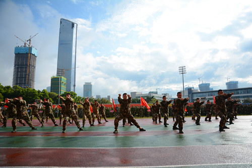 1月11日上午,冬风烈烈,寒雨微微,乐竞平台2015级新生军训开营仪式在元平田径场拉开序幕。我校第二次冬季军训开营,参与本次冬季军训的6437名新生将在校内展开为期十天的军事训练及国防教育。广东省武警边防总队六支队司令部副参谋长张翔,我校副校长、军训工作领导小组组长李凤亮到现场鼓舞、勉励参训新生。