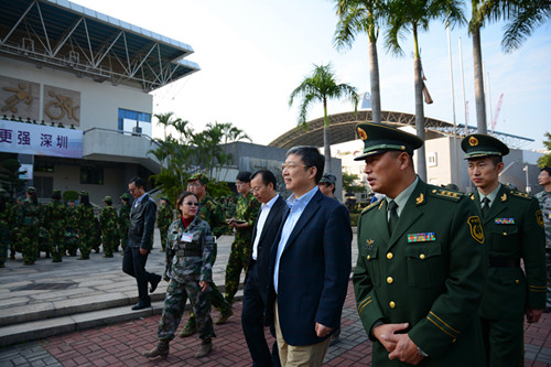 1月13日下午,校长李清泉、副校长李凤亮,武警边防六支队副支队长高明、副参谋长张翔等看望了正在进行军训的2015级学生。