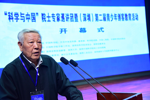 赵忠贤院士代表院士专家致辞。他说,深圳是一所充满朝气和践行创新驱动发展的城市。深圳这所年轻的城市,对于科学技术有强烈的需求,同时青少年具有创新能力。此次“中国与科学”院士专家巡讲活动与青少年创客活动的结合,这些院士专家所做报告,不仅是普及科学知识,更重要的是科学精神和方法,特别是院士专家敬业精神,社会的责任和团队精神,将对与青少年有更大的启发。