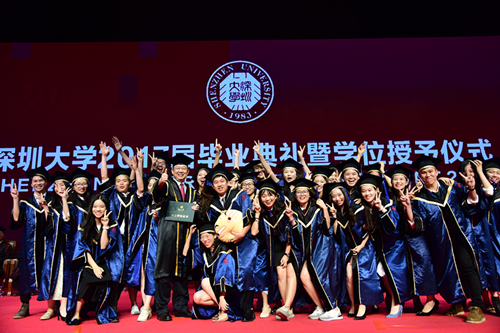 30多年来,十多万深大校友投身特区建设,从幼儿园老师到教授、博导;从公司白领到公务人员;从律政精英到金融才俊;从代表中国制造征战全球的科技达人到奥运赛场高扬五星红旗的体育健儿;从打造城市空间的地产大亨到塑造城市精神的创意巨头;从创业路上艰苦奋斗的年轻人到改变10亿人生活方式,公司市值超过70%国家GDP的大boss,他们与这座城市共同奋斗、共同成长,全力参与、亲身见证了小渔村蝶变为大都市的奇迹。这座城市的天际与隧道,高楼与街巷,到处奋斗着深大人的梦想。2016年初次就业数据显示,深大毕业生89%在深工作,多年来,这是绝大部分校友的共同选择。十几万校友的背后是几十万个家庭和成千上万家企业、团队,他们和亲人、朋友、同事及所有相关社群,共同构成了一个强大的“深大圈层”。他们贡献给城市的不仅是税收,更是一整个营商体系和创新生态;不仅是励志故事,更是一种改变与创造的文化品格;不仅是特区教育的成果背书,更是一座城市的未来和梦想。同学们,请你们记住:无论身处何方,你们的笑容就是深圳的颜值;你们的奋斗就是深圳的梦想;你们的未来就是深圳的未来!