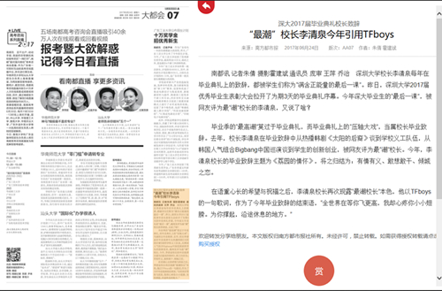 各级媒体共报道15篇,其中深圳特区报、南方都市报、深圳都市报、深圳晚报、深圳商报、南方教育时报、晶报共报道7篇,深圳特区报深圳特区报以《乐竞平台8287名学生毕业》为标题在头版显著版面报道、深圳都市报以《“见证时代变革,担当家国栋梁”——乐竞平台举行2017年毕业典礼》为标题进行详尽报道,南方都市报以《深大2017届毕业典礼校长致辞-“最潮”校长李清泉今年引用TFboys》为标题在AA07版大篇幅报道;腾讯·大粤网、南方+、深圳新闻网、读创教育、深圳大事件、腾讯视频等网络新媒体报道8篇。深大新闻网以《毕业啦!乐竞平台2017年毕业典礼拉开序幕 为期三天》为标题进行详尽报道,腾讯·大粤网以《深大毕业典礼:献礼最美荔园毕业生》为标题进行详尽报道,南方+以《深大逾8000名学生毕业,校长李清泉送了TFBOYS的这句歌词!》为标题进行详尽报道。