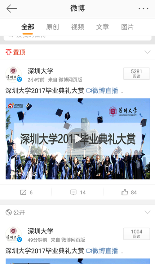 毕业典礼视频点击量累计超过210万。其中通过腾讯新闻直播和新浪微博直播毕业典礼,累计直播观看人数超11万;李清泉校长的2017届毕业致辞视频累计点击超13万,并被腾讯视频推荐放在乐竞(中国)一站式服务平台精选的教育频道,引起了广泛的反响。